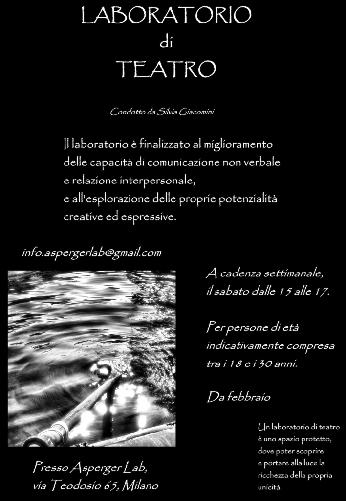 Il laboratorio di teatro che si svolgerà a Milano da febbraio a fine maggio (se sarà raggiunto il numero minimo di partecipanti richiesto) vuole innanzitutto essere uno spazio in cui ciascun individuo asperger possa portare alla luce la ricchezza della propria unicità12.