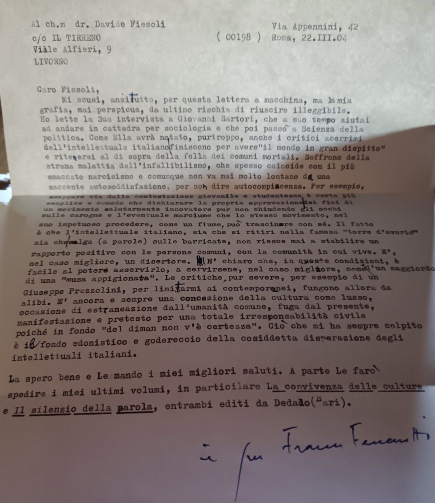 Ho letto moltissimi suoi libri, e molti ne ho recensiti quando lavoravo al quotidiano «Il Tirreno» , dove curavo la pagina dei libri. Proprio alla sede del «Tirreno», a Livorno, mi inviò una lettera preziosa, di vent’anni fa, datata 22 marzo 2004. Riportarla integralmente appare necessario non solo per ricordare l’alta statura del decano della Sociologia italiana, ma anche per l’importanza, vieppiù oggi, del suo contenuto. Eccola: