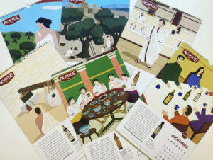 E via a seguire, di mese in mese, con testi di Luigi Caricato e illustrazioni di Doriano Strologo. In ogni mese c’è sempre il riferimento a una diversa bottiglia d’olio a marchio Agridè, riprodotta con ogni cura, accompagnata da un breve cenno all’olivaggio e la descrizione del profilo sensoriale.