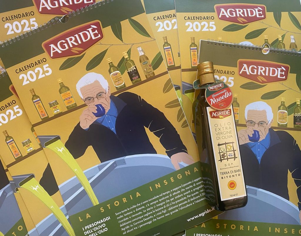 Ma intanto, ecco il Calendario Agridè 2025. Carmine Desantis è soddisfatto di questo percorso che sta compiendo insieme con i principali estimatori di Agridè, che da clienti e consumatori ne apprezzano i prodotti. La sua creatura, Agridè, nasce dopo una lunga esperienza nel settore oleario, e ne è la sua naturale evoluzione: rappresenta la Puglia alla perfezione, con una veste molto identitaria, che fa perno soprattutto su due varietà autoctone di grande pregio, Coratina e Ogliarola Barese o Cima di Bitonto, ma che nel contempo ha assunto un carattere di universalità. Sì, perché la famiglia di Carmine Desantis ha tanti estimatori che ne apprezzano l’olio e con esso anche lo stile dell’azienda, sempre attiva e operosa, sempre attenta alla qualità, senza mai trascurare alcun particolare. “Perché la qualità – sostiene giustamente Dora Desantis, responsabile qualità Agridè – deve essere totale”, come ha avuto modo di ribadire nel corso dell’ultima edizione di Olio Officina Festival”.