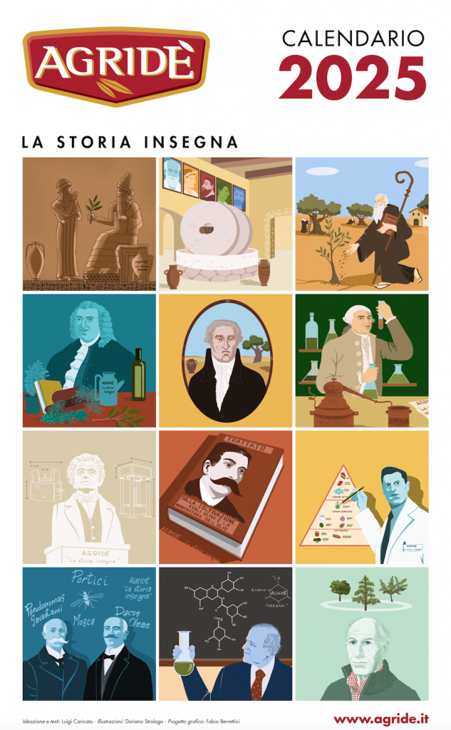 È un prodotto particolare, unico, caratterizzato da testi brevi ma eloquenti, e da illustrazioni a tutto campo suggestive e ricche di fascino. Le illustrazioni di questo 2025 sono state affidate all’artista Doriano Strologo, che ha già firmato altre edizioni del Calendario Agridè. Dopo l’edizione del 2016 si sono susseguiti tanti temi, che insieme costituiscono un percorso virtuoso.