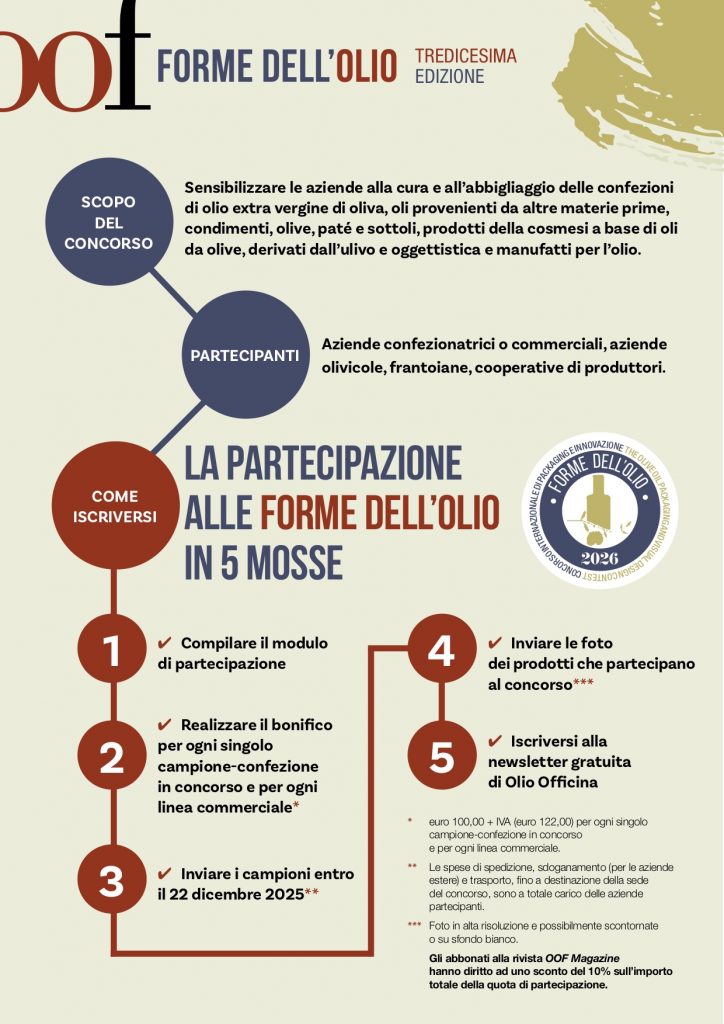 E ora? Che cosa ci si aspetta per l’edizione 2026 delle Forme dell’Olio? Nella redazione di Olio Officina arrivano le nuove proposte dei vari produttori, originali e propositive. Ovviamente non possiamo svelarvi nulla, perché attendiamo l’esito delle valutazioni della giuria. C’è tempo fino al 22 dicembre per partecipare, ma occorre fare in fretta perché il 2026 è alle porte e questa volta non ci saranno deroghe, in quanto la premiazione è anticipata al 23 gennaio, in occasione di Olio Officina Festival, evento giunto alla quindicesima edizione e che si terrà per la prima volta a Rho, in corso Europa 228, nelle sale del Centro congressi Mantovani Furioli.