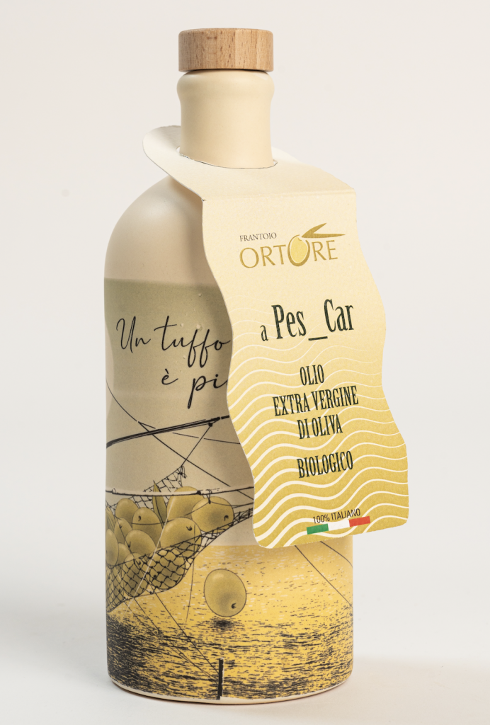 “L’orcetto a edizione limitata – ha dichiarato orgogliosa Isabella Ortore – arricchisce ulteriormente la nostra collezione”. Ed effettivamente è così, nel loro frantoio l’arte è di casa, così come l’artigianato. I frantoi d’altra parte devono essere non solo luoghi di produzione, ma di cultura e di accoglienza. E così – spiega la Ortore – parafrasando una canzone degli anni Ottanta, della Formula 3, campeggia sull’orcio il motto “un tuffo dove l’olio è più cru”. L’immagine colpisce, colpisce la sfera emotiva di chi acquista l’orcio ed è pronto a degustare l’olio da Ogliarola garganica. Ecco cosa dice Isabella Ortore, nel motivare questa nuova creazione: “un mare d’olio, un trabucco, le reti piene di olive, il nostro olio dal gusto persistente e ricco, che ricorda la forza e la determinazione delle piante di ulivo e degli olivicoltori, legati come noi da un amore viscerale che si ritrova in ogni goccia del nostro olio, mentre dall’alto della loggia del trabucco, a Peschici, sedute di fronte a un panorama mozzafiato lo gustiamo a crudo su bruschetta o in un’insalata di mare”.