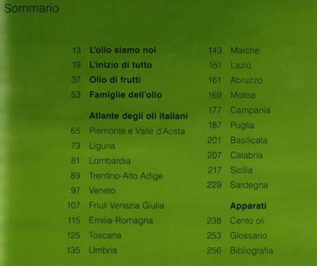 Nel libro sono anche indicati cento oli italiani: “Non sono i cento oli migliori d’Italia, ma una scelta di oli eccellenti insieme a una scelta di oli rappresentativi dell’ingegno e della creatività.”