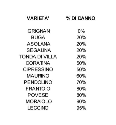 La penultima colonna riporta la percentuale di olive cadute, calcolata sulle drupe presenti subito dopo la fioritura prima dell’inizio dei sintomi.
