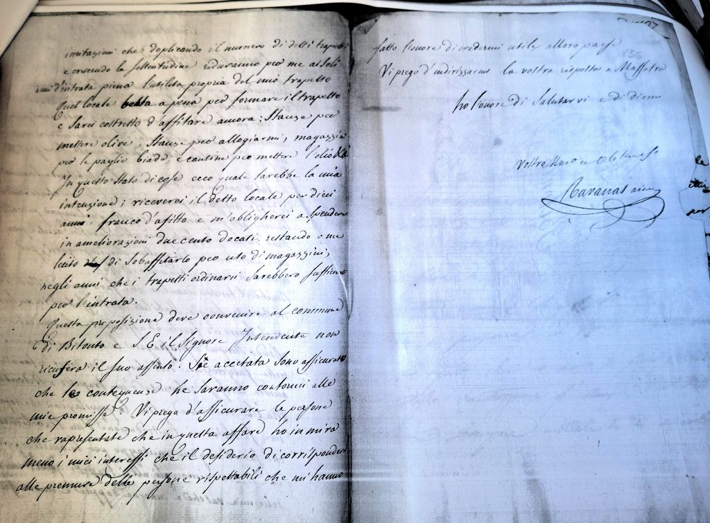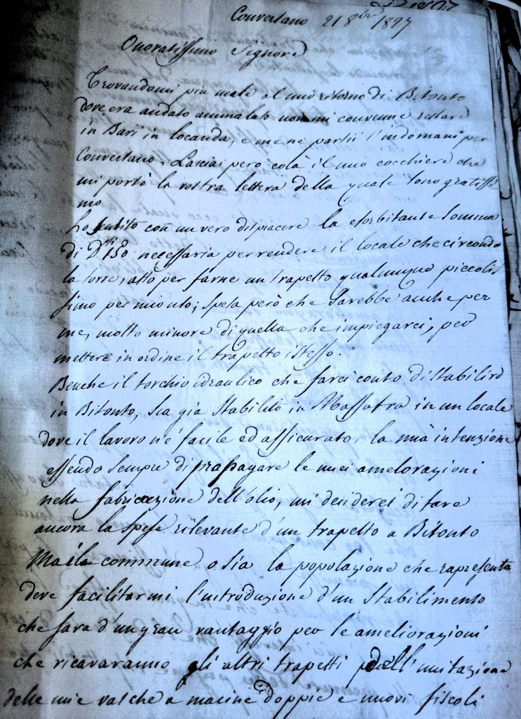 “…la mia intenzione, essendo sempre di propagare le mie ameliorazioni nella fabbricazione dell’olio, mi desidererei di fare ancora la spesa rilevante d’un trappeto a Bitonto, ma il comune, ossia la popolazione che rappresenta, deve facilitarmi l’introduzione di uno stabilimento che sarà d’un gran vantaggio per le ameliorazioni che ricaveranno gli altri trappeti dall’imitazione delle mie vasche a macina doppia e nuovi fiscoli, imitazioni che duplicando il numero di detti trapeti e crescendo la sollecitudine ridurranno per me ai soli anni d’entrata piena l’utilità propria del mio trapeto… quel locale basta a pena per formare il trapeto e sarei costretto d’affittare ancora: stanza per mettere olive, stanza per alloggiarmi, magazzino per la paglia biada, e cantine per mettere l’olio. In questo stato di cose ecco quale sarebbe la mia intenzione, riceverei il detto locale per dieci anni franco d’affitto e mi obbligherei a spendere in ameliorazioni duecento ducati, restando a me lecito di subaffittarlo per uso di magazzini negli anni che i trapeti ordinari sarebbero sufficienti per l’entrata. Questa proposizione deve convenire al comune di Bitonto. Se accettata sono assicurato che le conseguenze ne saranno conformi alle mie promesse. Vi prego di assicurare le persone che rappresentate che in questo affare ho in mira meno i miei interessi che il desiderio di corrispondere alle premure delle persone rispettabili che mi hanno fatto l’onore di credermi utile al loro paese”.