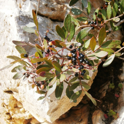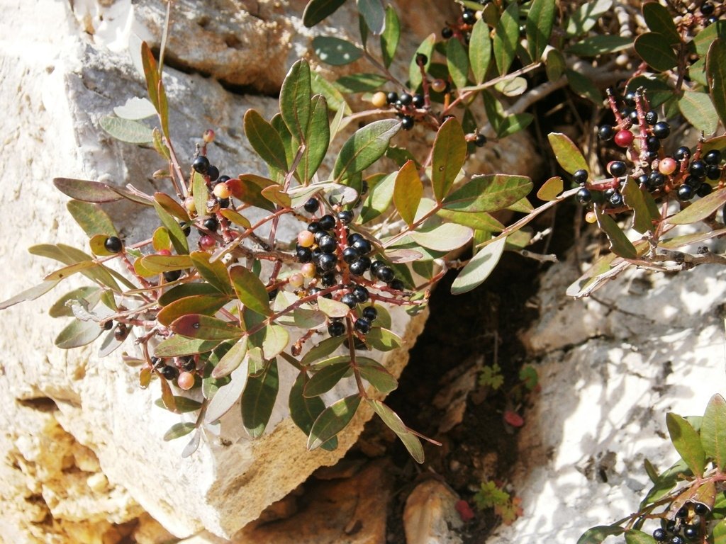 Il frutto è una piccola drupa sferica di colore verdastro ad inizio della fruttificazione, tendente al nero a piena maturazione passando per un colore rosso acceso. La fioritura ha luogo in tarda primavera, mentre i frutti diventano ben visibili in pieno autunno colorando la macchia mediterranea di punteggiature rosso acceso, per poi giungere a piena maturazione ad inverno inoltrato.