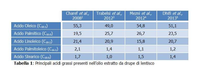 Alla luce degli ultimi lavori pubblicati il lentisco può essere considerato a tutti gli effetti una pianta a frutti oleaginosi in quanto le sue drupe possiedono un contenuto di olio che, a seconda dell’origine della pianta, dei fattori genetici, dello stadio di maturazione delle drupe e delle condizioni climatiche, varia dal 30% al 42%.2,3 La composizione in acidi grassi, principali costituenti di un olio vegetale, è comparabile, se non qualitativamente superiore, a quella dei più conosciuti oli vegetali. Nell’olio di lentisco infatti, gli acidi grassi più rappresentati sono in ordine decrescente: acido oleico, palmitico, linoleico, palmitoleico e stearico (Tab. 1). L’acido oleico costituisce più del 50% degli acidi grassi totali. Questo è un acido grasso monoinsaturo dalle numerose proprietà salutistiche, appartiene alla classe dei MUFA (MonoUnsaturated Fatty Acid). Segue l’acido palmitico, acido grasso saturo (Saturated Fatty Acid, SFA) con un contenuto che, in media, supera di poco il 20%. Successivamente, in concentrazione di poco inferiore al 20%, vi è l’acido linoleico. Quest’ultimo acido grasso appartiene alla categoria degli acidi grassi polinsaturi (PolyUnsaturated Fatty Acid, PUFA), serie degli omega-6 e risulta essere un acido grasso dai numerosi ruoli biologici, essenziale per l’organismo poiché la biosintesi endogena non è in grado di soddisfare appieno il fabbisogno totale.