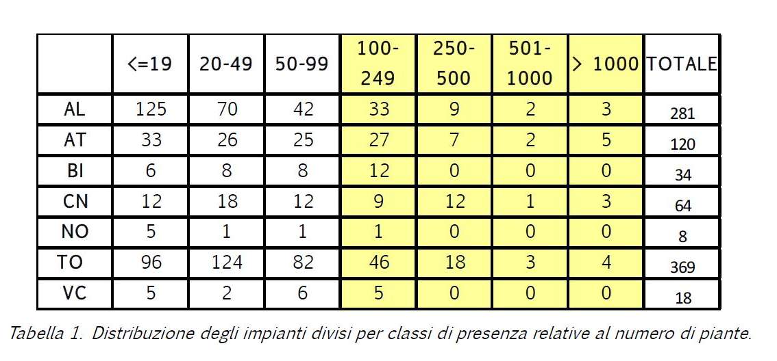 Ad oggi il maggior numero di piante coltivate per singola azienda è stato riscontrato in provincia di Torino (circa 3200 unità) segue una azienda della provincia di Cuneo (2800), una della provincia di Alessandria (2300) ed una di Asti (2000).