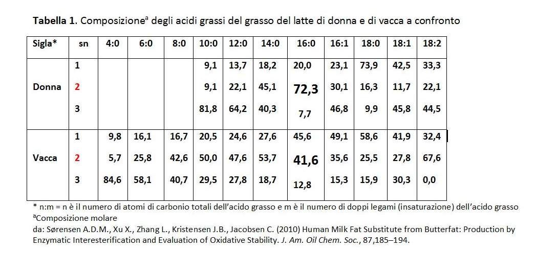 -nella fascia di età dei bambini nelle membrane cellulari la protezione cellulare è ottenuta con la presenza di acidi grassi saturi, come la composizione del latte materno nei lipidi e in particolare degli acidi grassi in posizione 2 dei trigliceridi (con il 72% molare della presenza di acido palmitico, oltre all’11% di acido stearico, Tabella 1) che irrigidiscono la membrana in sostituzione del colesterolo ancora poco sintetizzato in quel periodo della vita;