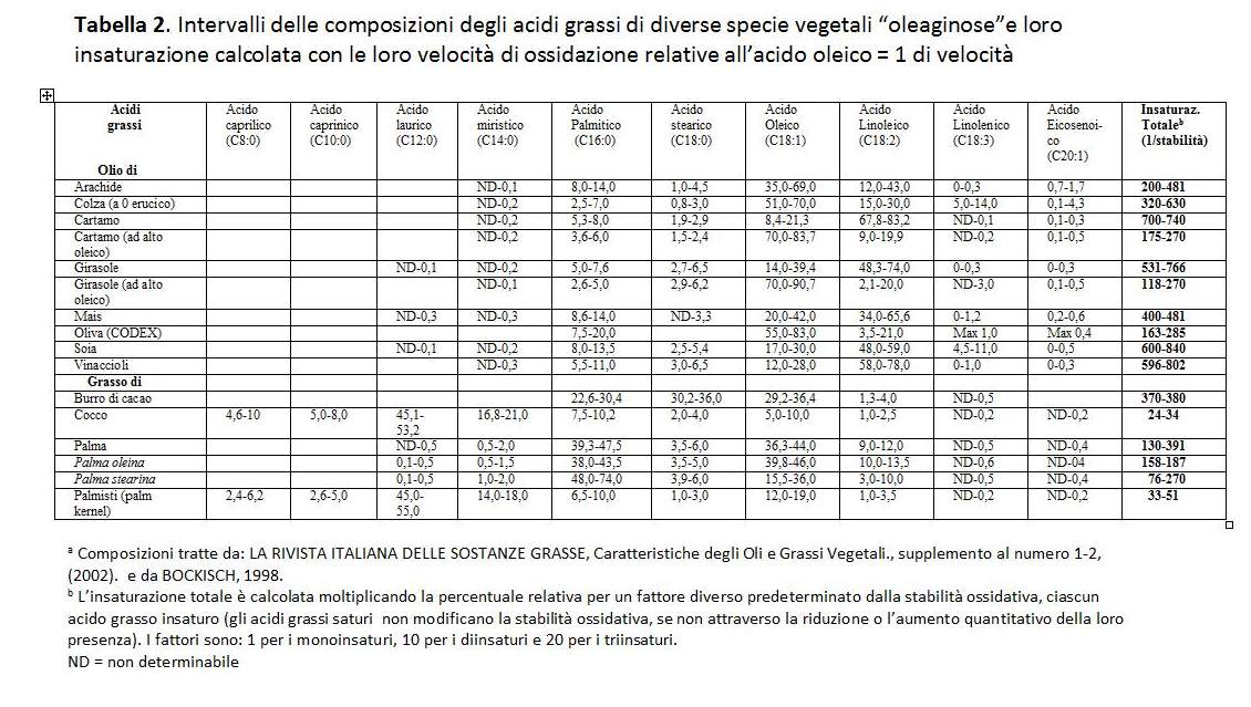 Ora, il fatto che oggi si senta -timidamente- affermare che gli oli di semi fanno venire il cancro, è spiegabile ipoteticamente basandosi sull’instabilità all’ossidazione che hanno gli acidi grassi polinsaturi, di cui sono ricchi (Tabella 2). In letterature si trovano alcuni lavori che parlano di oli di mais (ma che valgono anche per quelli di soia, girasole, colza, ecc.) sui quali sono state fatte sperimentazioni scientifiche a riguardo (li ho ricevuti da un nostro Collega, qualche anno fa e forse oggi se ne troverebbero anche altri in internet).