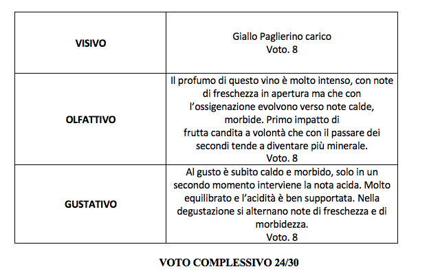Colore giallo carico, ha naso definito ed evoluto che cambia con il passare dei secondi e con l’ossigenazione da note fruttate note minerali. Di grande equilibrio al gusto, è ben bilanciato tra freschezza e sapidità, con lunghi e persistenti richiami perfettamente conformi all’olfatto.