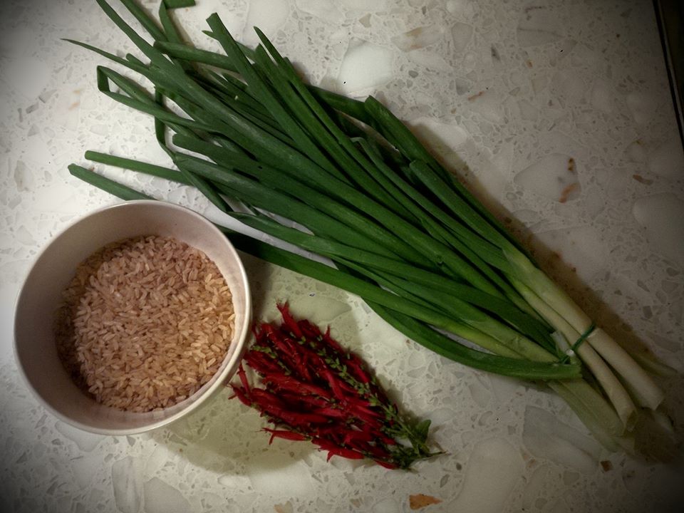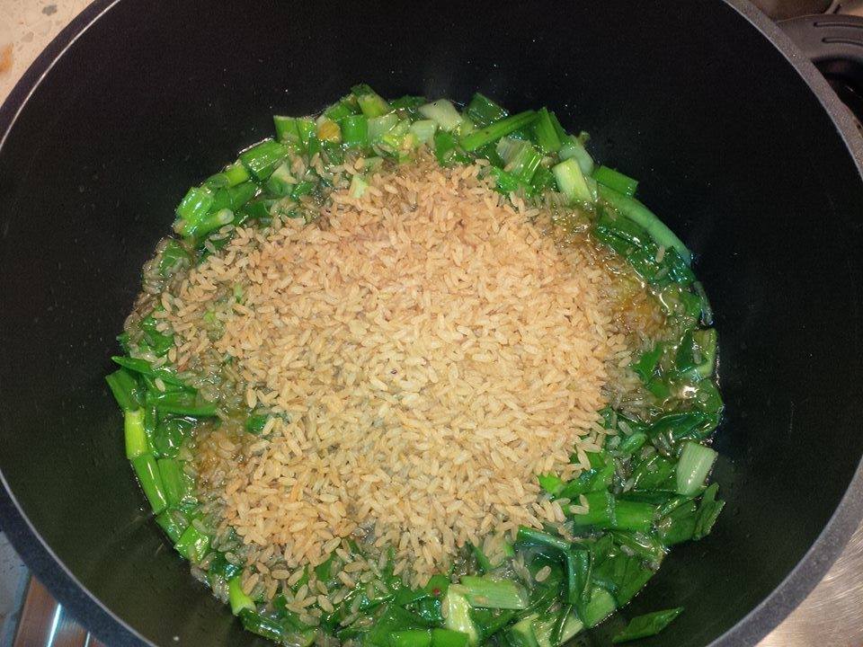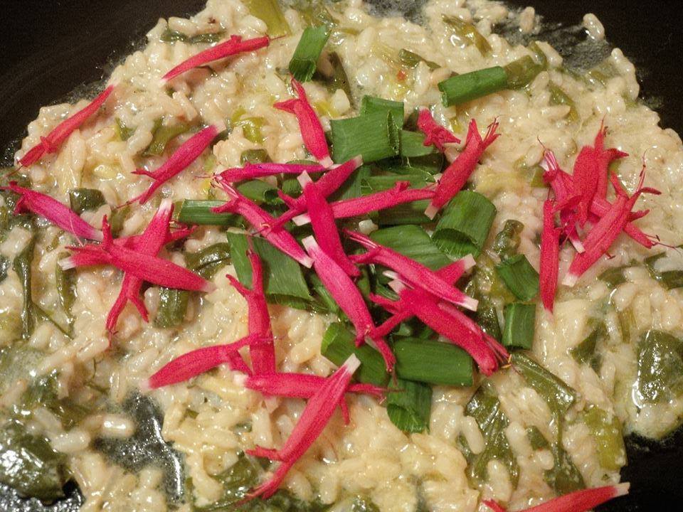 Per bagnare il riso, usare un brodo con i bulbi sotterranei di cipolla egiziana. A fine cottura per sprigionare al massimo il sapore e gli aromi, aggiungere una manciata di foglie di cipolla egiziana tritata e fiori di salvia ananas.