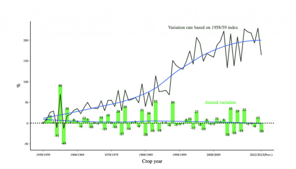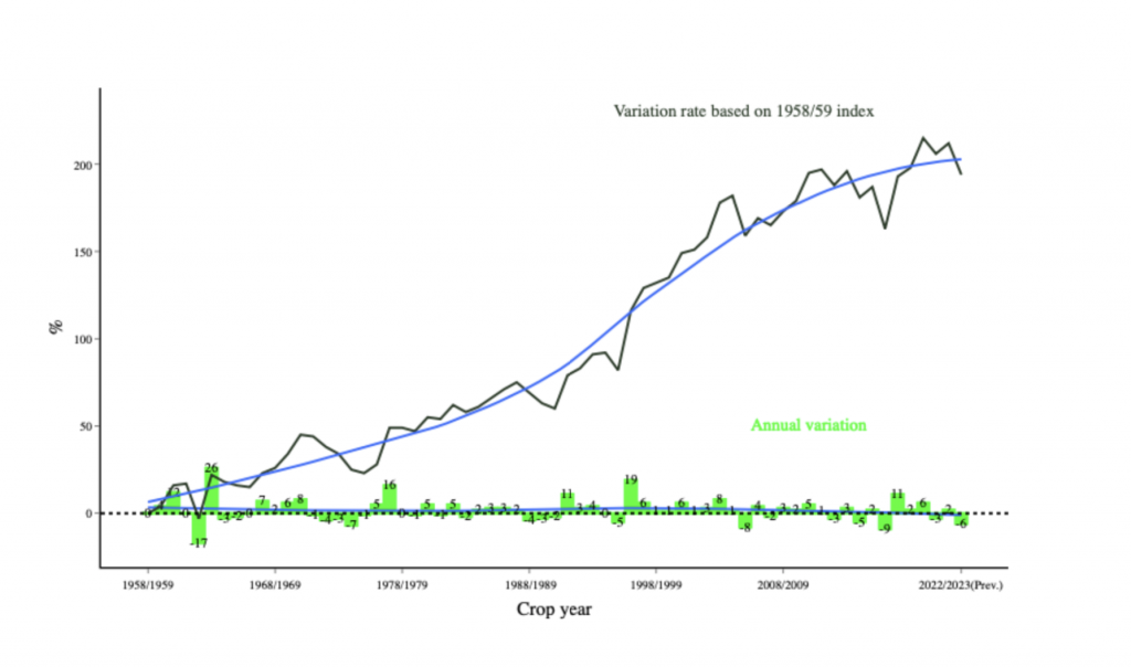 Nei primi anni Novanta la media produttiva era inferiore a 100.000 tonnellate; nel 2022/23 ha contribuito con 380.000 tonnellate.