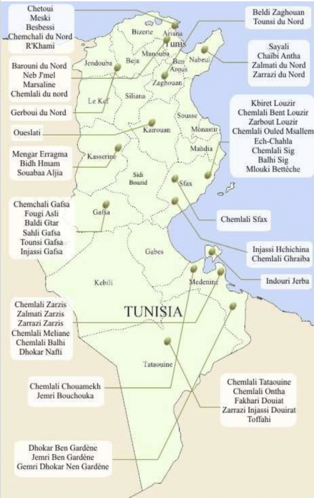 •Varietà: 80 % Chemlali;10% Chètoui; Zarrazi, Oueslati e altre
