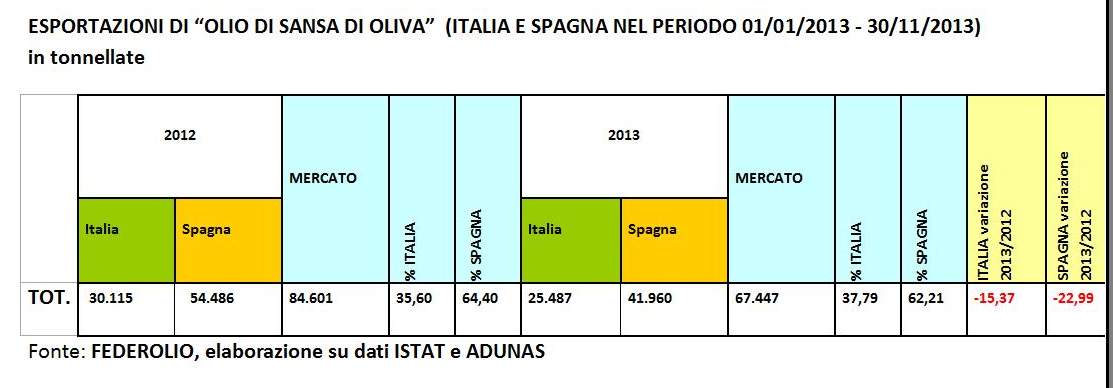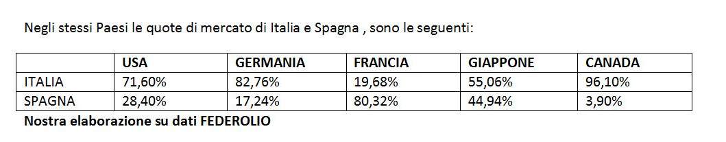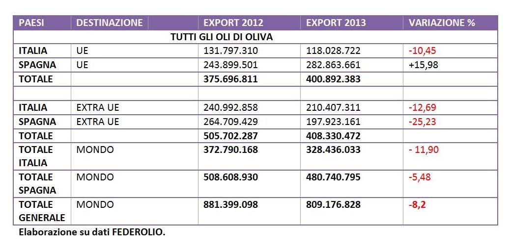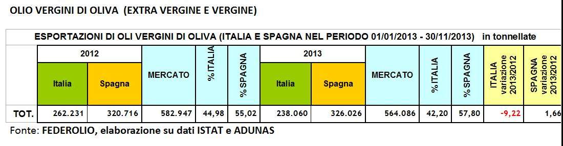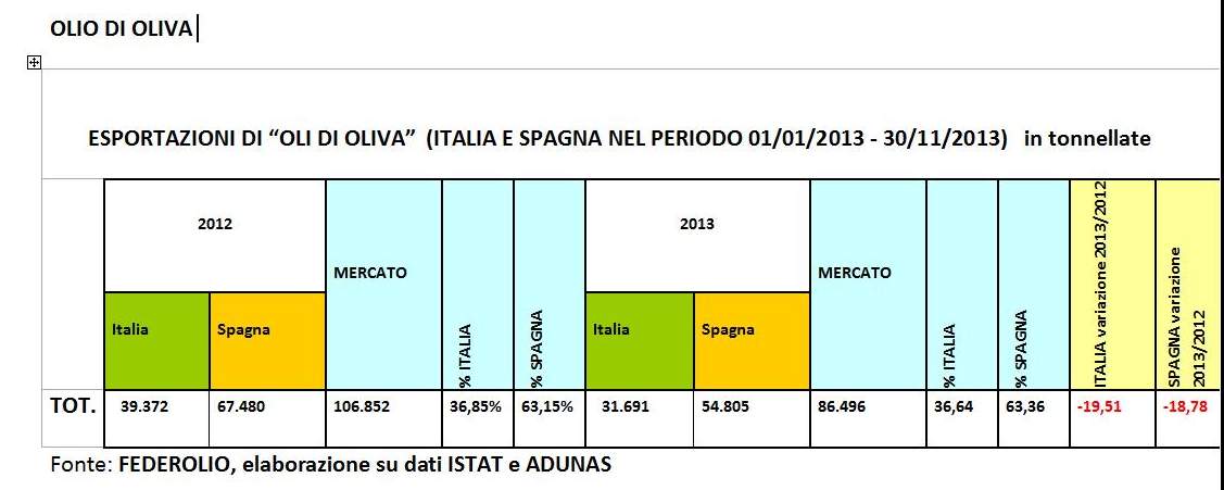 Dal confronto tra Italia e Spagna per quanto riguarda le vendite di olio di oliva verso il resto del mondo, nel periodo 01/01/2013-30/11/2013 (elaborazione Federolio su dati ISTAT e ADUANAS), emerge quanto segue: