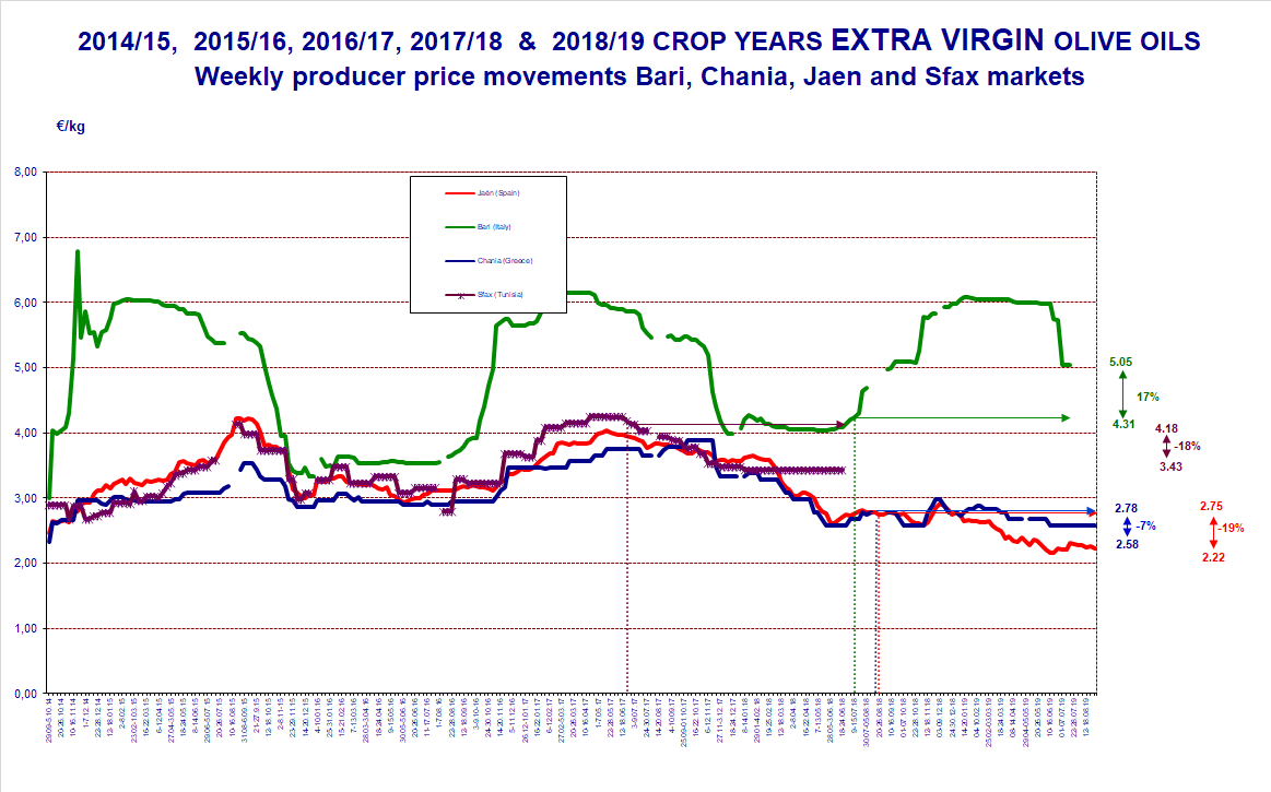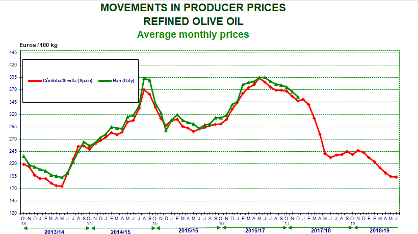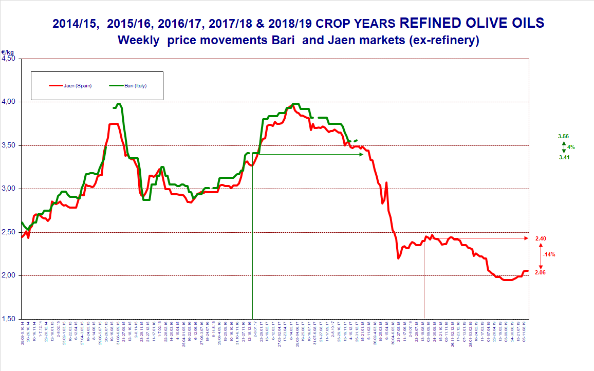 La differenza nella terza settimana di agosto 2019 tra olio extra vergine di oliva (€ 2,22 / kg) e il prezzo dell’olio raffinato di oliva (€ 2,06 / kg) in Spagna è di € 0,16 / kg . In Italia questa differenza a dicembre 2017 era di 0,43€ / kg.