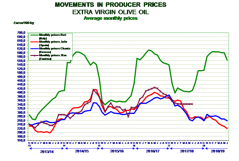 Prezzi in origine – Oli di oliva. La figura 1 illustra l’evoluzione settimanale dei prezzi alla fonte dell’olio extra vergine di oliva nei tre principali paesi produttori dell’Ue e della Tunisia, la figura 3 illustra l’evoluzione settimanale dei prezzi all’origine dell’olio raffinato di oliva in entrambi i principali paesi produttori dell’Ue. L’evoluzione dei prezzi mensili per queste categorie è mostrata nei grafici 2 e 4.