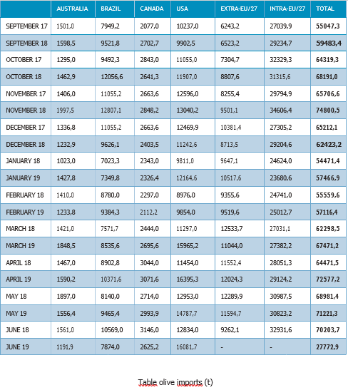 Olive da tavola- Campagna 2018/2019.Il commercio di olive da tavola durante i primi dieci mesi della campagna 2018/19 (settembre 2018 – giugno 2019), nei mercati indicati nella tabella seguente, mostra un aumento del 16% negli Stati Uniti, del 7% in Brasile, del 6% in Australia e 1% in Canada, rispetto allo stesso periodo della campagna precedente. Il commercio Ue di olive da tavola nei primi nove mesi della campagna 2018/19 (settembre 2018 – maggio 2019). Le acquisizioni intra-Ue e le importazioni extra-Ue aumentano rispettivamente del 3% e dell’1% rispetto a allo stesso periodo della campagna precedente.