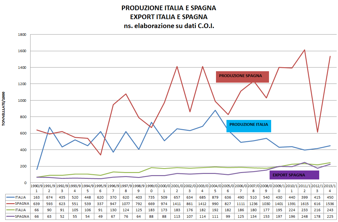 A fronte di una produzione più o meno stabile italiana, si può apprezzare la forte crescita della produzione spagnola, fatta eccezione per la campagna 2012/2013.