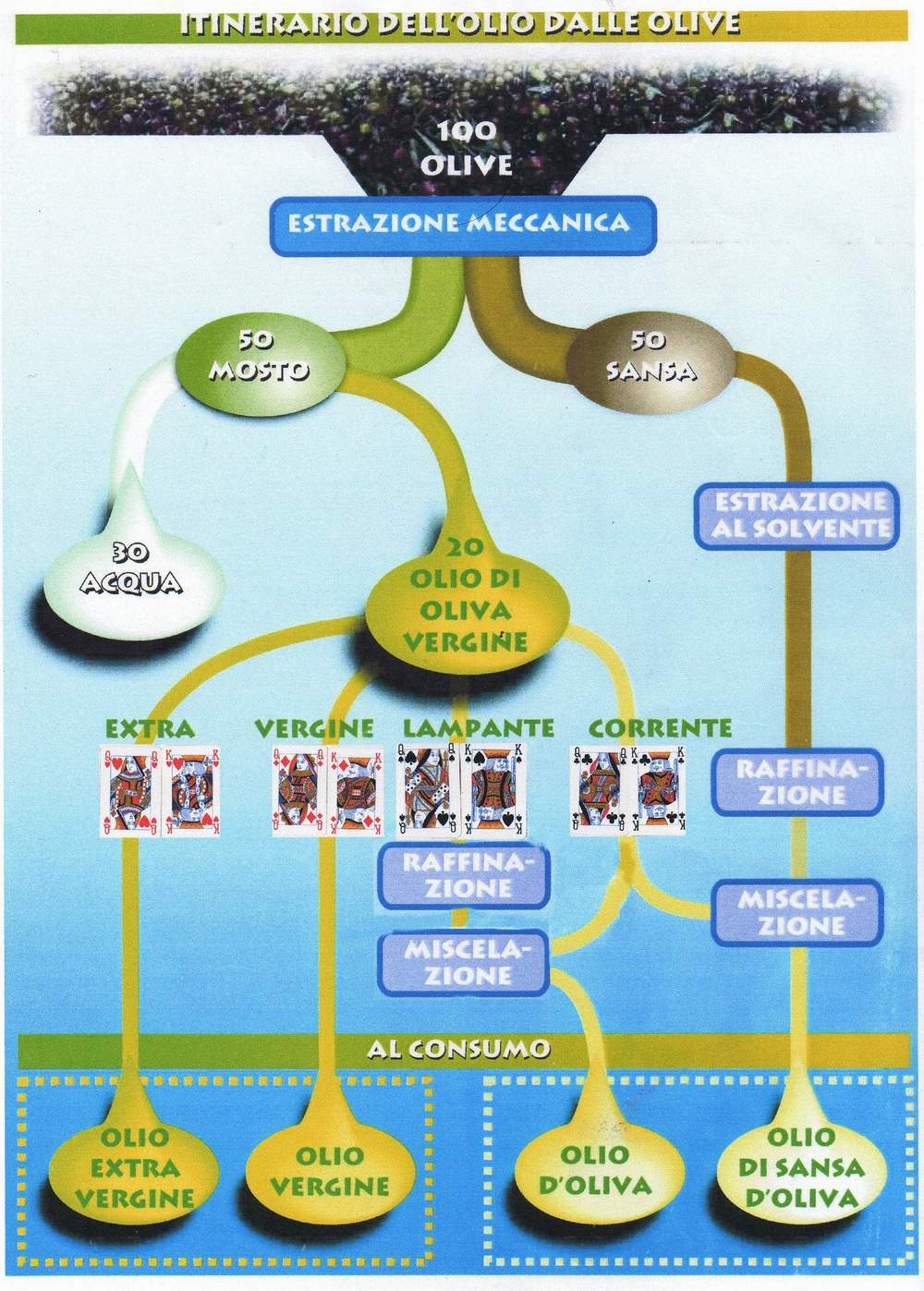 Da un quantitativo di 100 olive si ricava, per estrazione meccanica, 50 di residuo secco (sansa) e 50 di mosto costituito da 30 di acqua e 20 di olio di oliva vergine, che viene esaminato dai panel di degustatori e analizzato in laboratorio.