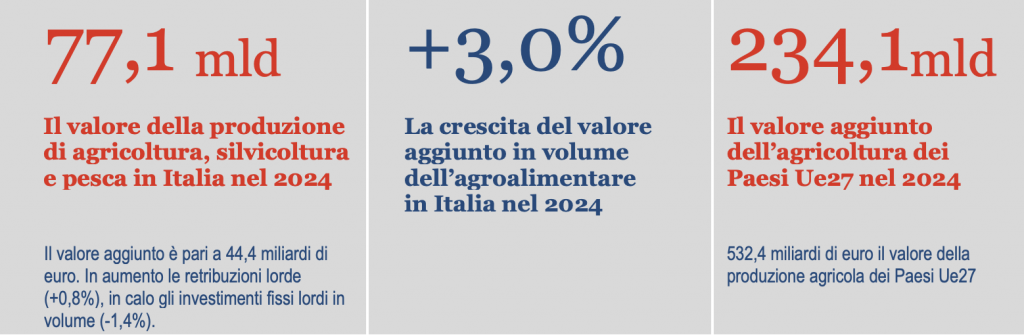 Il valore aggiunto agricolo della Ue27 nel 2024 ha raggiunto i 234,1 miliardi di euro, da 223,9 miliardi del 2023 (+4,5%). L’Italia con un valore aggiunto di 43,0 miliardi di euro (pari al 18,4% del valore aggiunto della Ue27) ha conquistato il primato europeo del valore aggiunto agricolo. La Spagna ha raggiunto la seconda posizione (38,5 miliardi, 16,5%), superando la Francia che è scesa in terza posizione (35,4 miliardi, 15,1%), seguita in quarta posizione dalla Germania (31,1 miliardi, 13,3%).