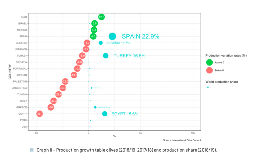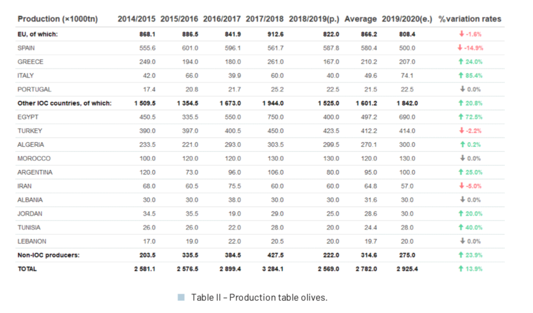 Secondo i dati provvisori, la produzione mondiale nell’annata 2018/19 si attesta a 2.569.000 tonnellate, in calo del 21,7% rispetto all’annata precedente. Tra i paesi membri, la Spagna si distingue per la produzione, che rappresenta il 22,9% del totale mondiale, con un aumento del 4,6% rispetto all’anno precedente.