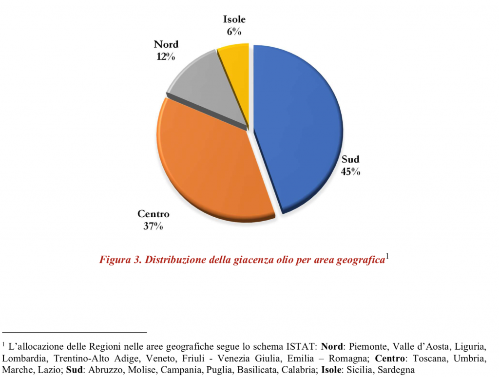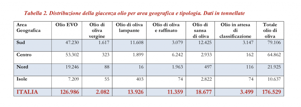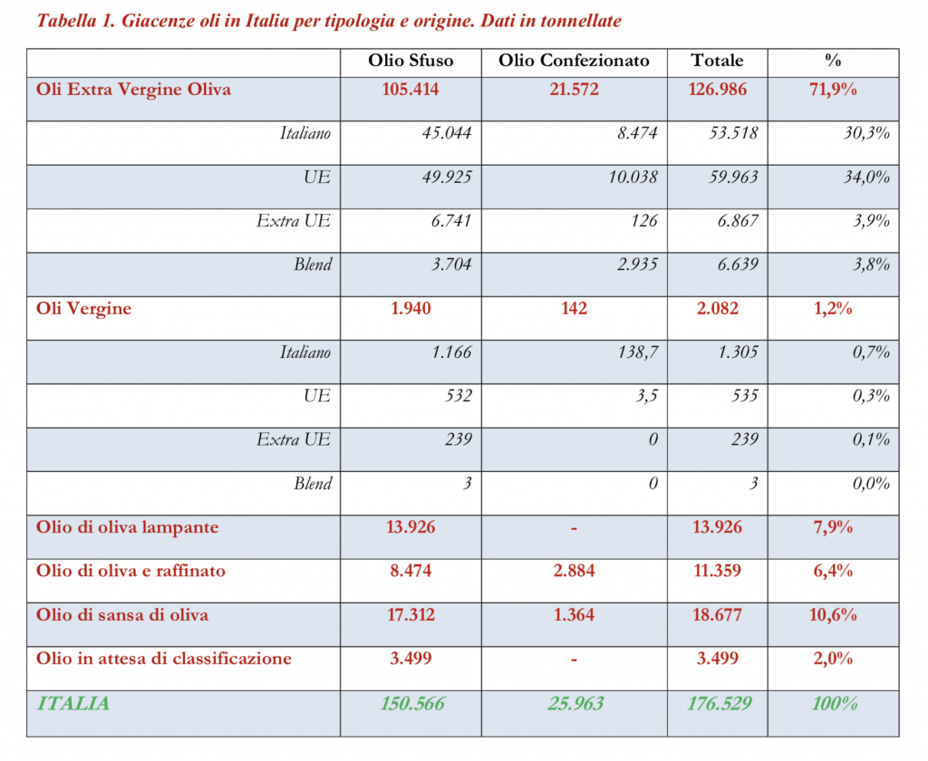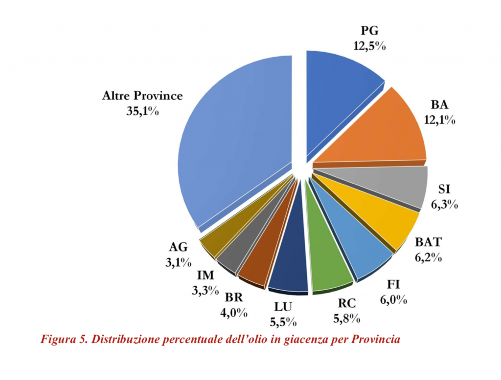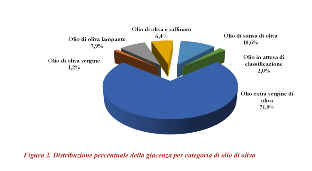 Solo l’1,2% delle giacenze è rappresentato dall’olio vergine di oliva.