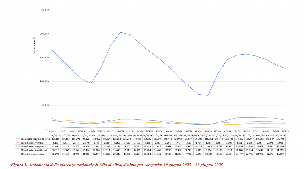 Lo stock di olio detenuto in Italia il 30 giugno 2025 ammonta a 176.529 tonnellate, di cui il 71,9% è rappresentato da olio extra vergine di oliva (Evo). Nell’ambito dell’olio Evo, il 42,1% è di origine italiana (53.518 t), il prodotto di origine EU rappresenta il 47,2%.