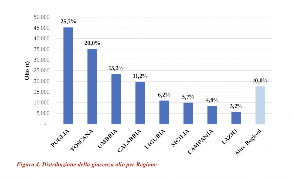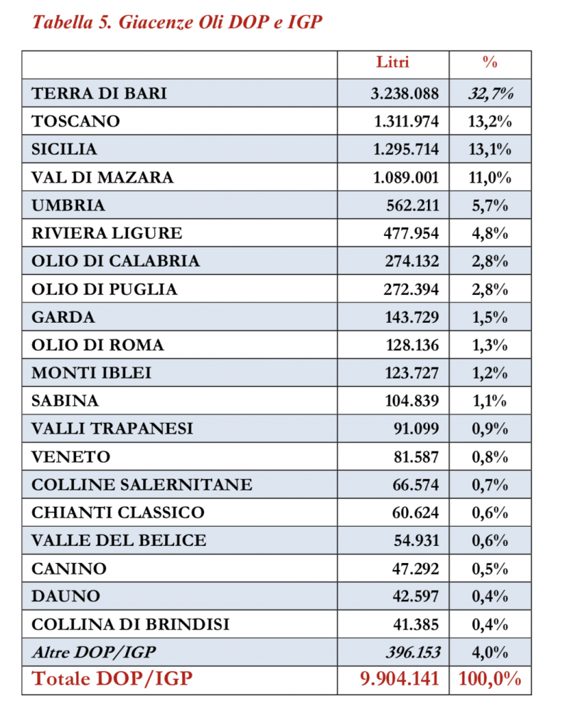 Nel complesso, l’olio a Dop/Igp in giacenza è pari al 5,2% del totale presente in Italia e rappresenta il 7,2% dell’olio Evo stoccato.