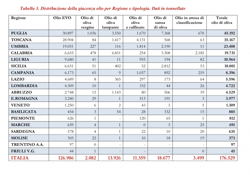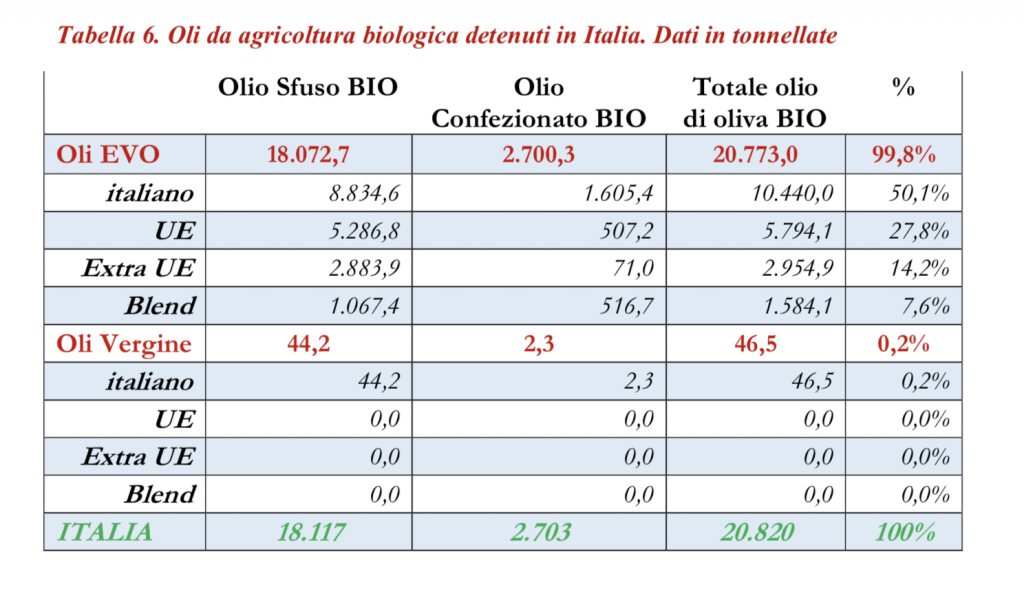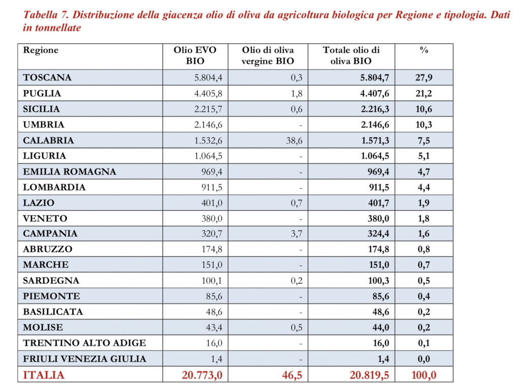 La giacenza totale di “olio extra vergine di oliva” e di “olio vergine di oliva” da agricoltura biologica risulta pari a 20.820 tonnellate (-19,2% rispetto allo stesso periodo dell’anno precedente), di cui il 99,8% Evo, pari al 16,4% dell’Evo complessivamente detenuto in Italia. L’olio Bio è detenuto prevalentemente in Toscana, Puglia, Sicilia e Umbria.