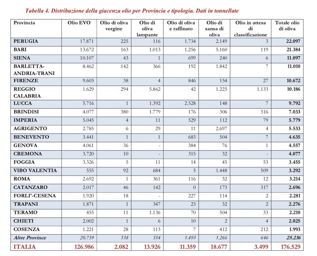 Il 44,8% della giacenza nazionale di olio di oliva è presente nelle regioni del Sud Italia, con il significativo contributo delle regioni Puglia e Calabria (25,7% e 11,2%, rispettivamente). A livello provinciale, da segnalare il 12,5% delle giacenze nella provincia di Perugia e il 12,1% nella provincia di Bari.