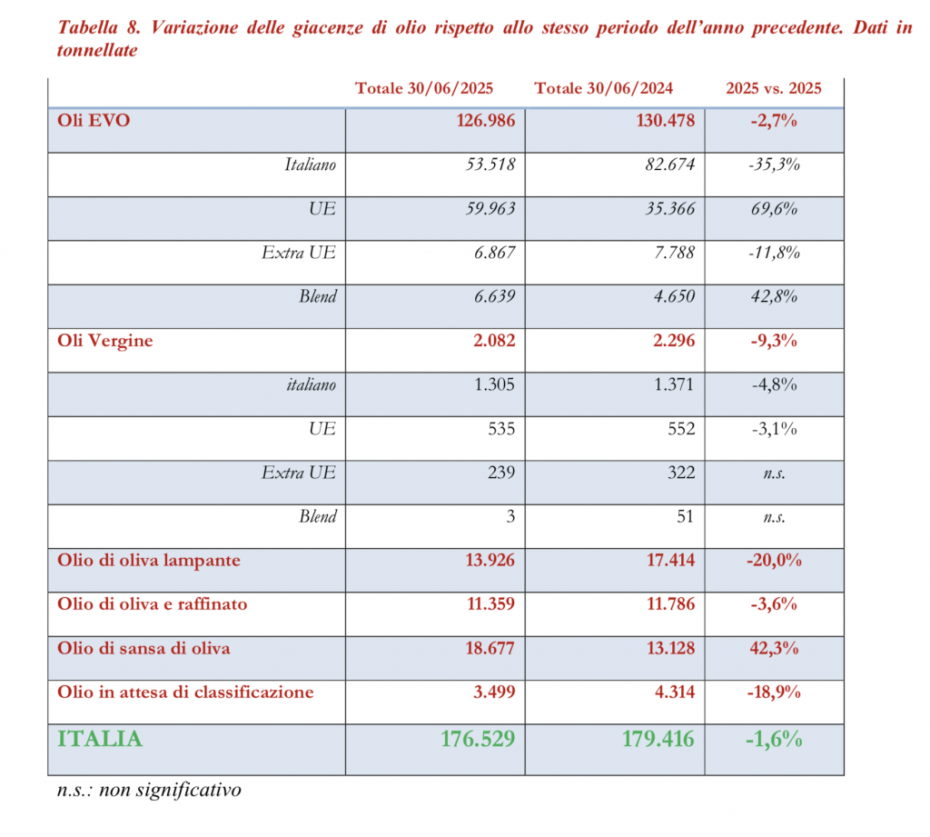 Le giacenze di olio al 30 giugno 2025 risultano del 1,6% inferiori rispetto allo stesso periodo dell’anno precedente. Ciò è dovuto prevalentemente alla riduzione delle giacenze di olio Evo (- 2,7%) e olio lampante (-20,0%), parzialmente bilanciata dall’aumento delle giacenze di olio di sansa di oliva (+42,3%).