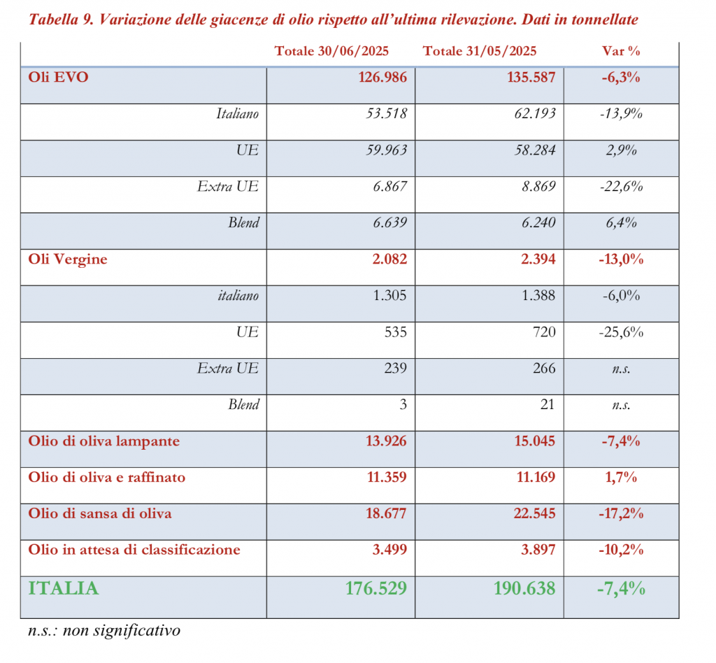 Rispetto al 31 maggio 2025, le giacenze di olio sono inferiori del 7,4%. Dato legato principalmente alla riduzione delle giacenze degli oli Evo (-6,3%) e, soprattutto, a quelli di origine italiana (-8.676 t). In calo risultano anche le giacenze di olio di oliva lampante (-7,4%) e di olio di sansa di oliva (- 17,2%).