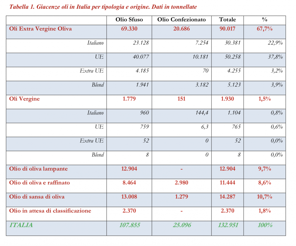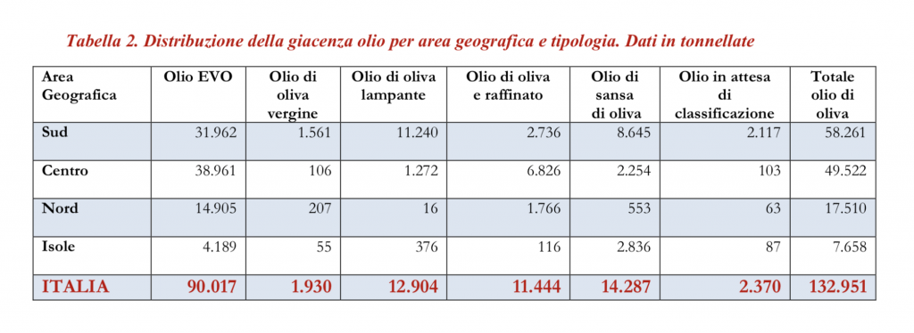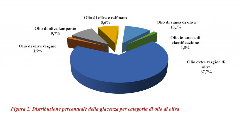 Solo l’1,5% delle giacenze è rappresentato dall’olio vergine di oliva.