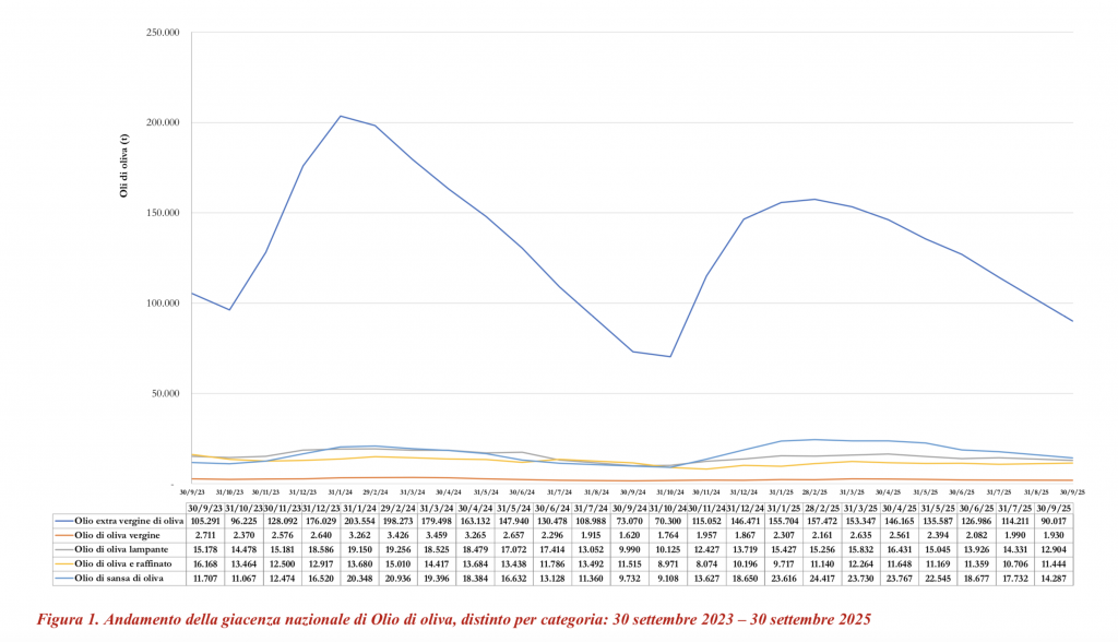 Le giacenze di olio al 30 settembre 2025 risultano del 21,9% superiori rispetto allo stesso periodo dell’anno precedente. Ciò è dovuto prevalentemente all’aumento delle giacenze di olio Evo (+23,2%), olio di sansa di oliva (+46,8%) e olio lampante (+29,2%).