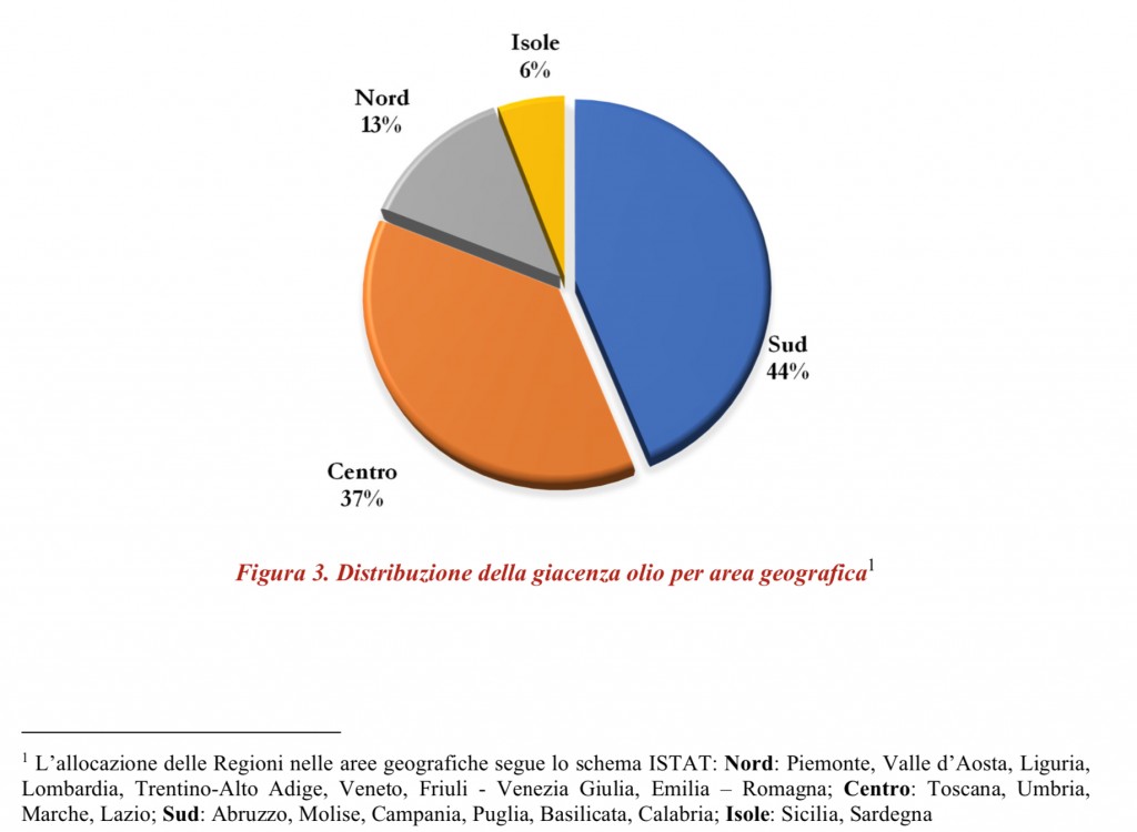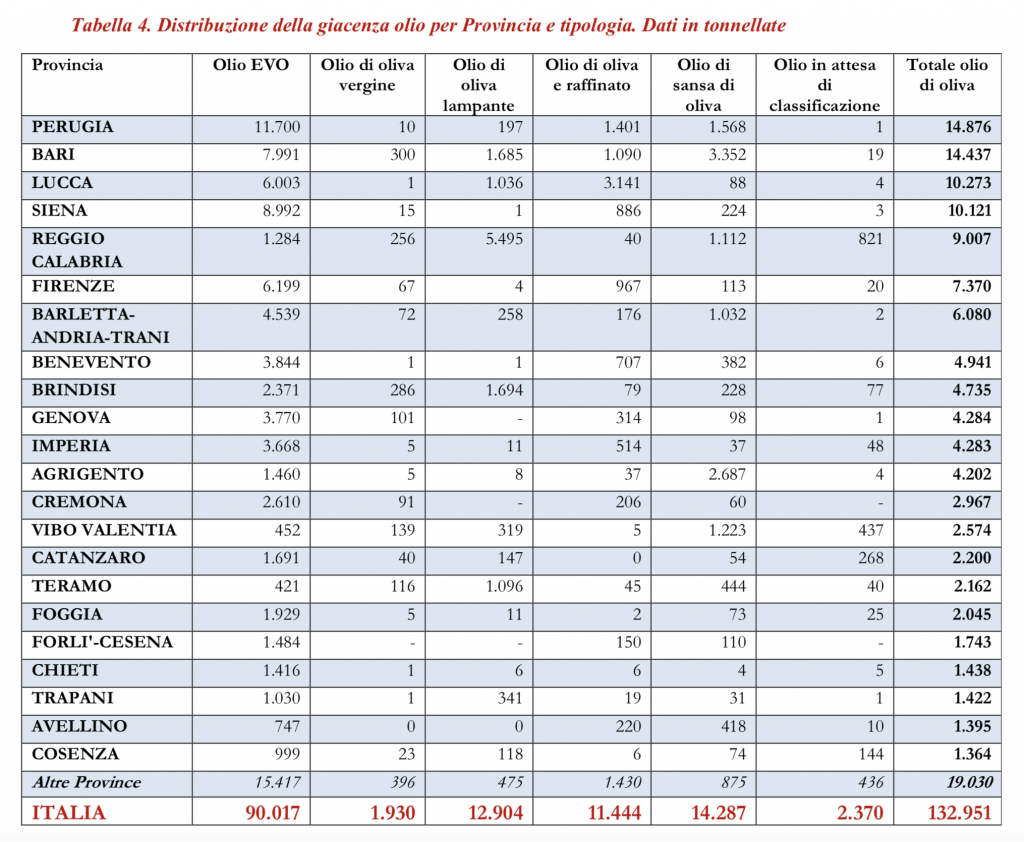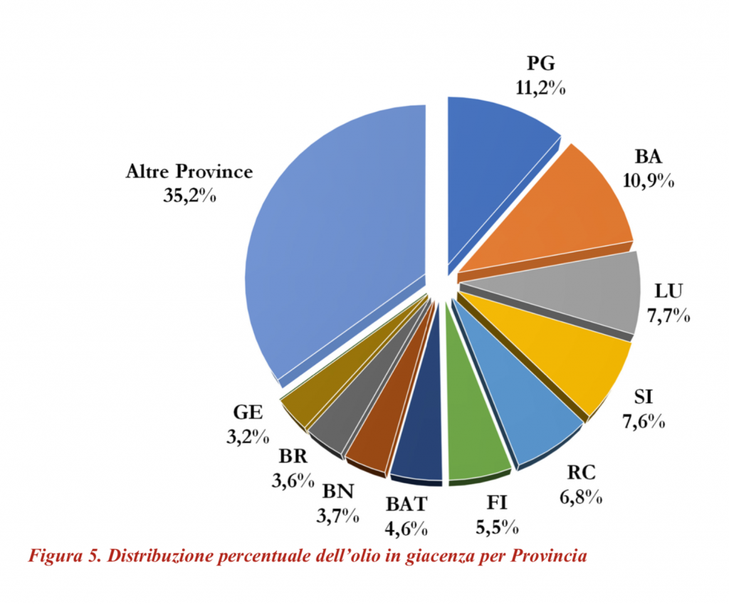 Il 43,8% della giacenza nazionale di olio di oliva è presente nelle regioni del Sud Italia, con il significativo contributo delle regioni Puglia e Calabria (21,9% e 12,4%, rispettivamente). A livello provinciale, da segnalare il 11,2% delle giacenze nella provincia di Perugia e il 10,9% nella provincia di Bari.