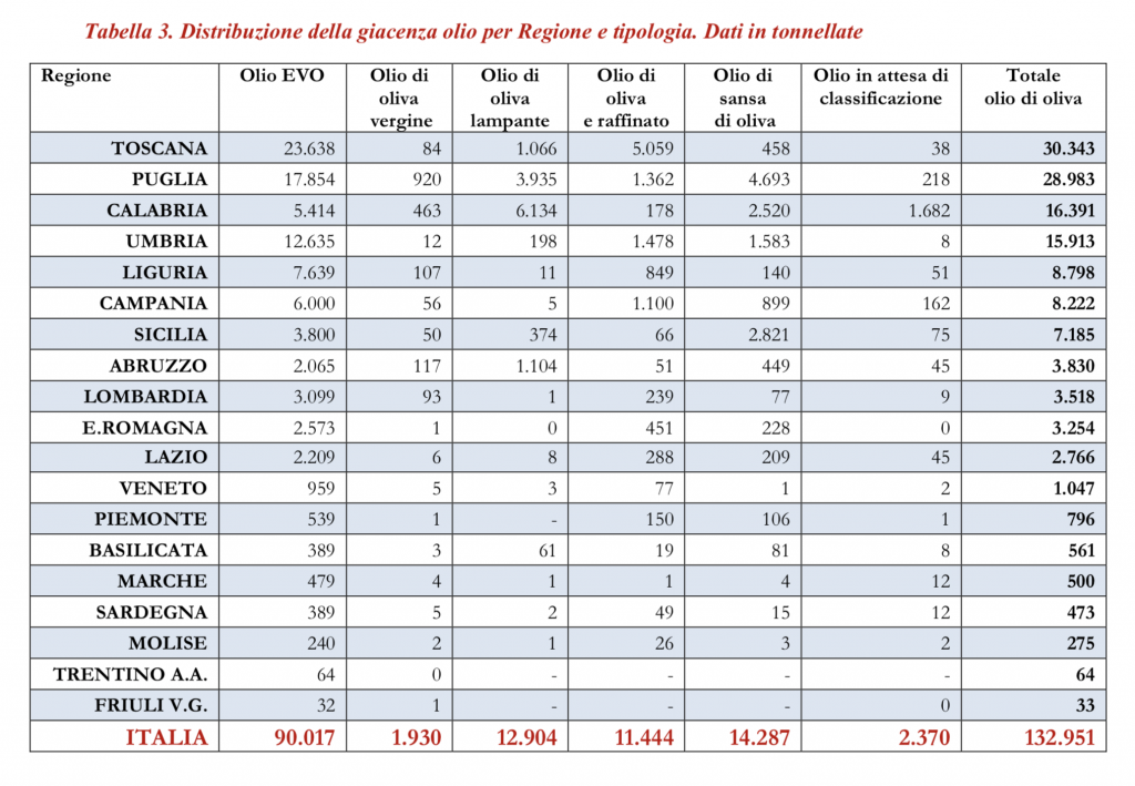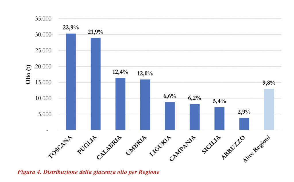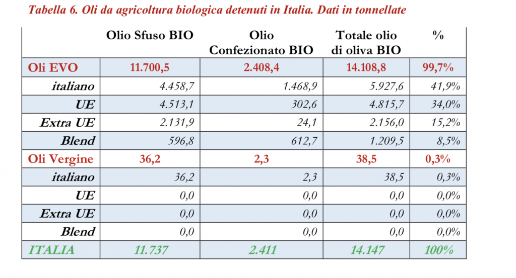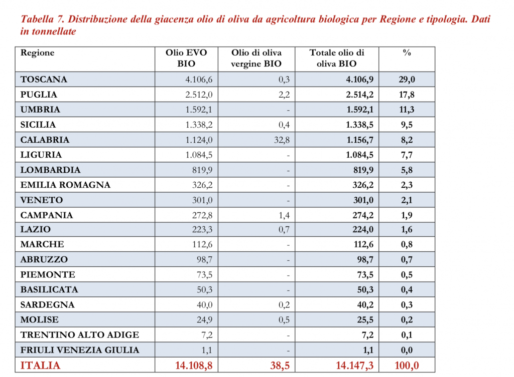 La giacenza totale di “olio extra vergine di oliva” e di “olio vergine di oliva” da agricoltura biologica risulta pari a 14.147 tonnellate (+13,5% rispetto allo stesso periodo dell’anno precedente), di cui il 99,7% Evo, pari al 15,7% dell’Evo complessivamente detenuto in Italia. L’olio Bio è detenuto prevalentemente in Toscana, Puglia, Umbria e Sicilia.