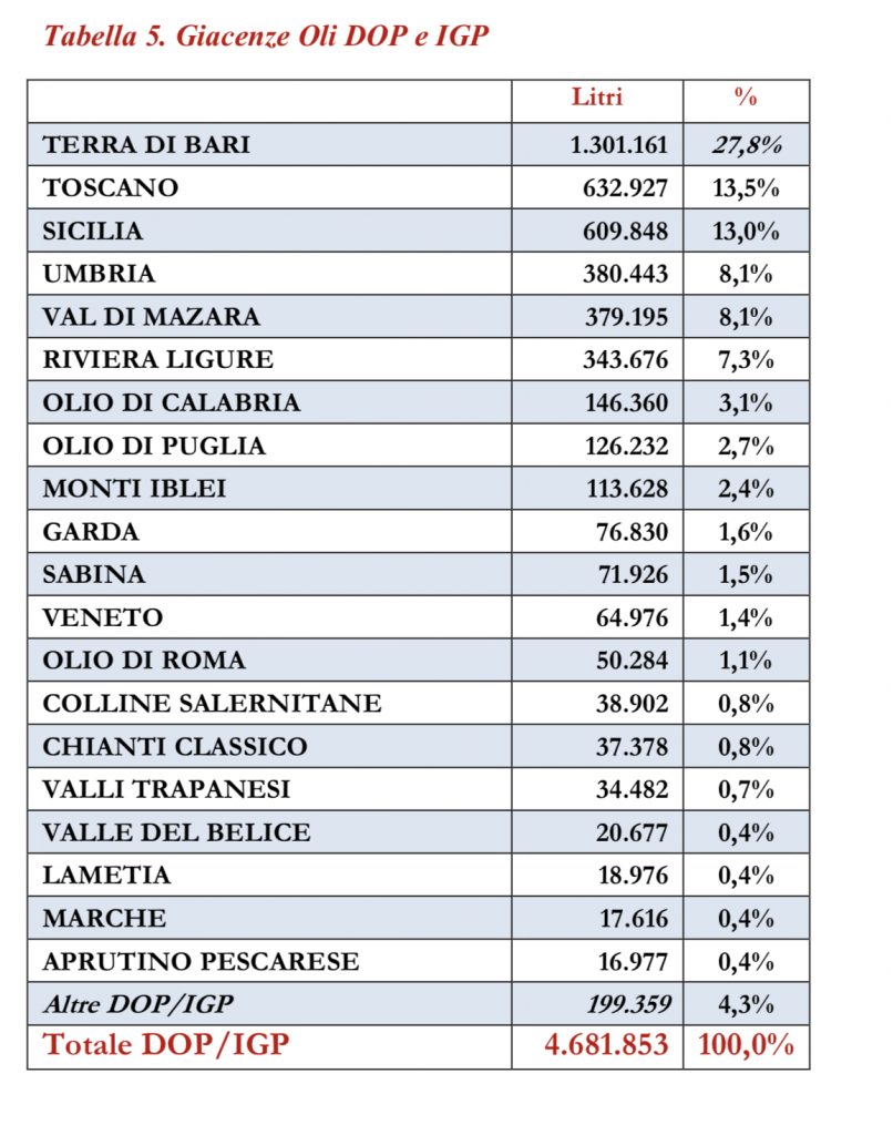Nel complesso, l’olio a Dop/Igp in giacenza è pari al 3,2% del totale presente in Italia e rappresenta il 4,8% dell’olio Evo stoccato.