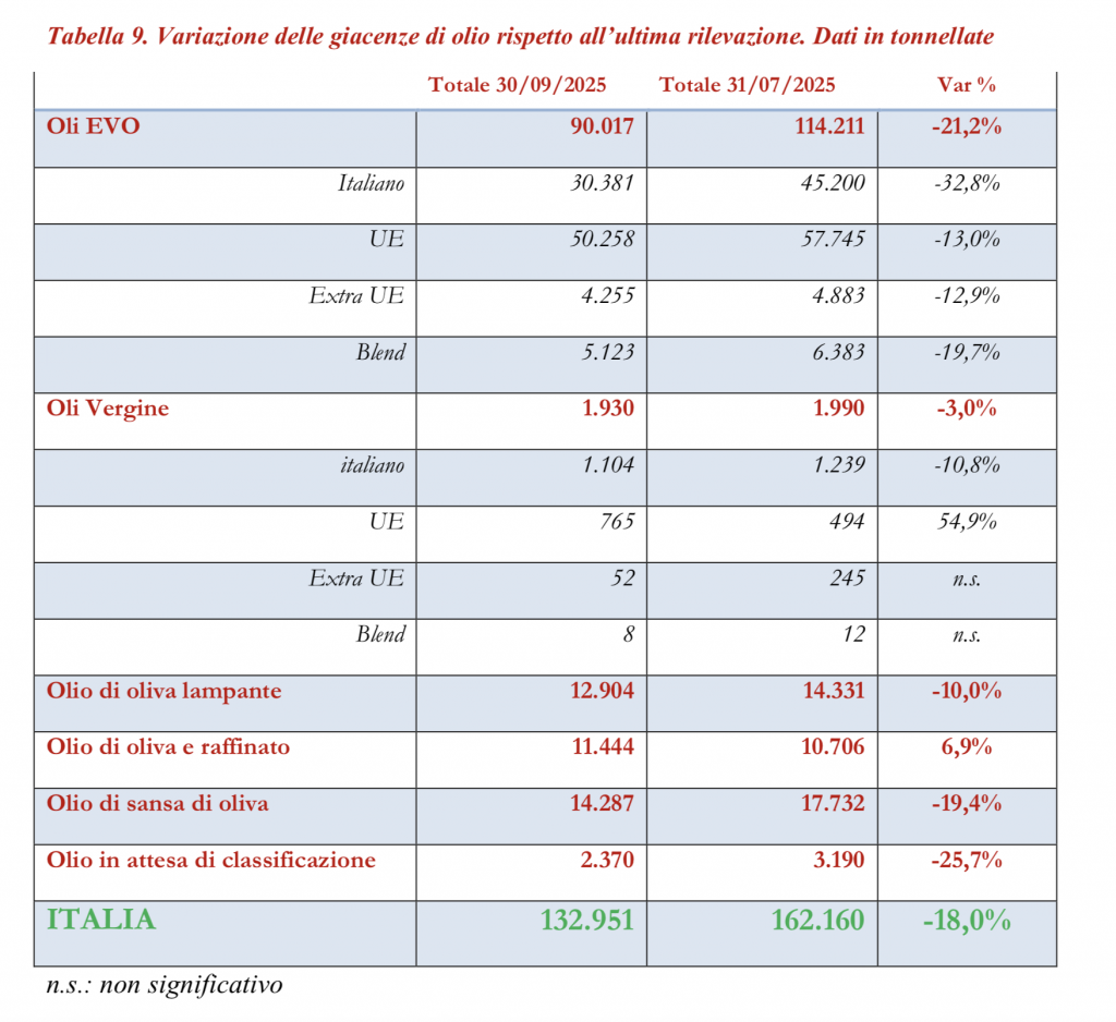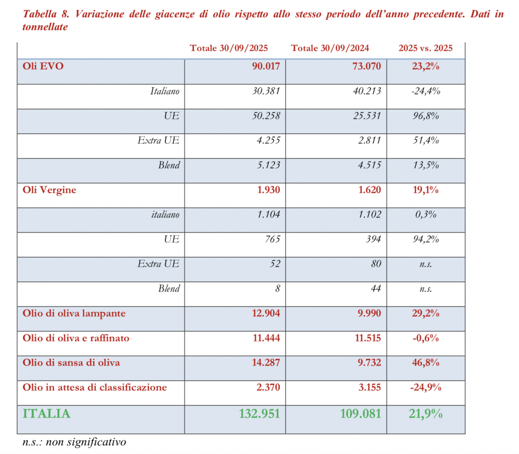 Lo stock di olio detenuto in Italia il 30 settembre 2025 ammonta a 132.951 tonnellate, di cui il 67,7% è rappresentato da olio extra vergine di oliva (Evo). Nell’ambito dell’olio Evo, il 33,8% è di origine italiana (30.381 t), il prodotto di origine EU rappresenta il 55,8%.