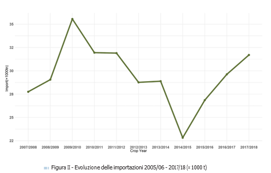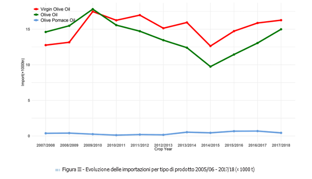 L’evoluzione delle importazioni di oli di oliva vergini e oli di oliva mostra un cambiamento di tendenza a partire dalla campagna 2014/2015. Il volume importato di oli di oliva vergini è aumentato del 27,5%. Il dato emerge se si confrontano le campagne 2017/2018 con la 2007/2008. Il volume degli oli di oliva vergini rappresentavano il 46,0% delle importazioni totali.
