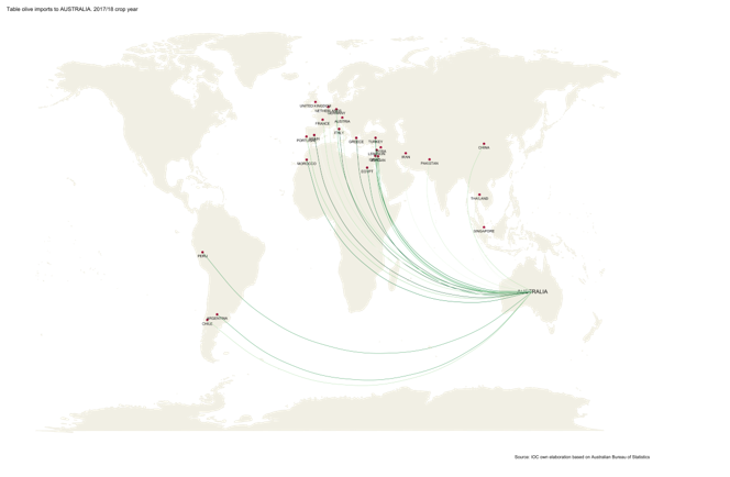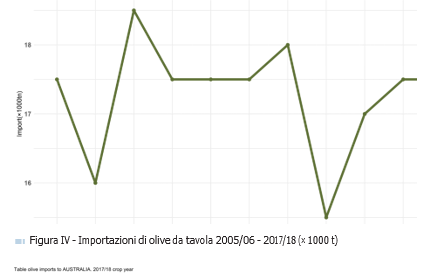 Il mercato australiano delle olive da tavola è di circa 17.000 tonnellate nelle ultime 11 campagne, e raggiunge nell’ultima campagna 2017/18 (settembre 2017 – agosto 2018) le 17.259,9 tonnellate, che rappresentano il 2,7% di importazioni mondiali.