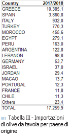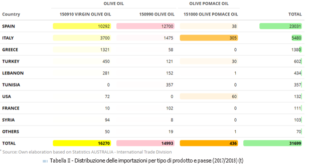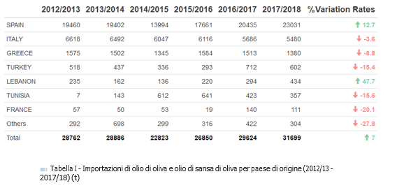 Per origine delle importazioni, il 94,6% del totale proviene dall’Unione europea. Il restante 5,4% proviene principalmente da Turchia 1,9%, Libano 1,4% e Tunisia 1,1%.Per quanto riguarda i volumi per categoria di prodotti, il 51,3% delle importazioni totali è stato registrato con il codice 15.09.10 (oli di oliva vergini), seguito dalle importazioni corrispondenti al codice 15.09.90 (oli di oliva ) con il 47,3% e il restante 1,4% corrisponde alle importazioni del codice (15.10.00) (oli di sansa di oliva).