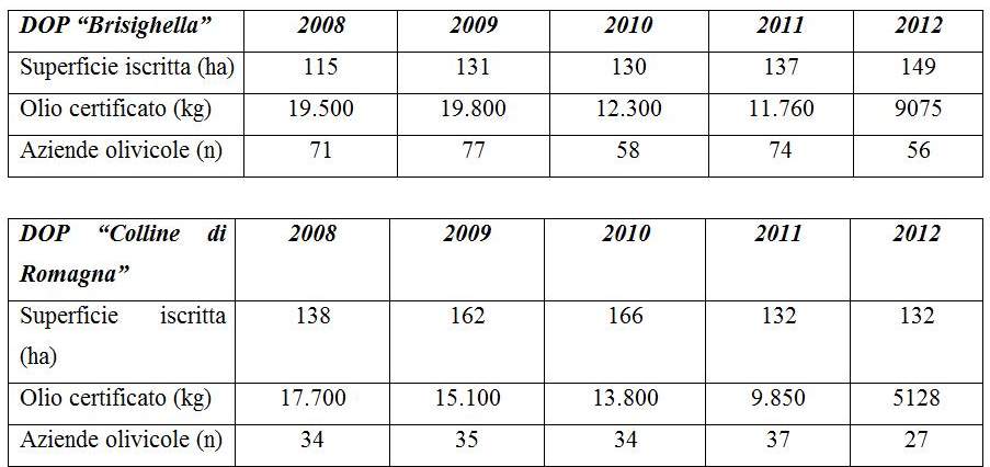 I dati relativi alle filiere produttive degli oli Dop Brisighella e Colline di Romagna nelle ultime campagne sono i seguenti: