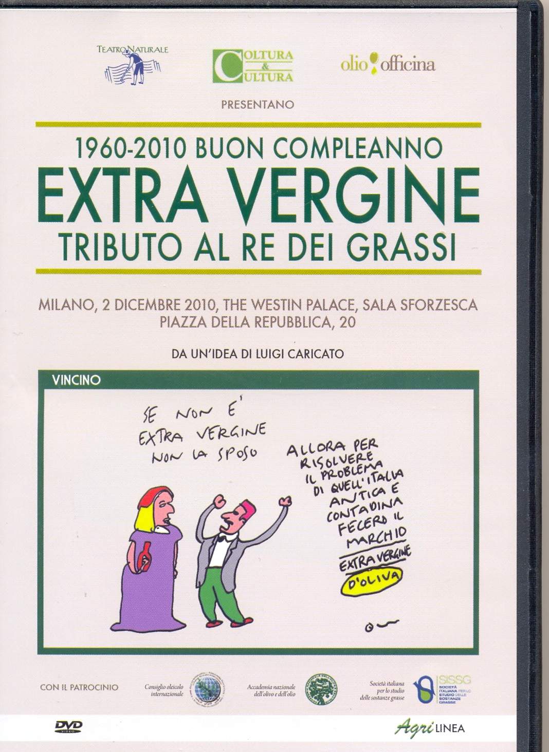 “1960-2010. Buon compleanno extra vergine. Tributo al re dei grassi”. Quella che vedete è la copertina del dvd che riportava, in quattro distinte parti, i lavori di una giornata fiume da me ideata. Era il 2 dicembre 2010, quando organizzai a Milano, mentre ancora ero in Teatro Naturale, e in collaborazione con Coltura & Cultura di Bayer CropScience e il nascente blog Olio Officina (perché allora era solo un blog, non il progetto che successivamente si è andato costituendo) una giornata intensa dedicata ai cinquant’anni dell’olio extra vergine di oliva.
