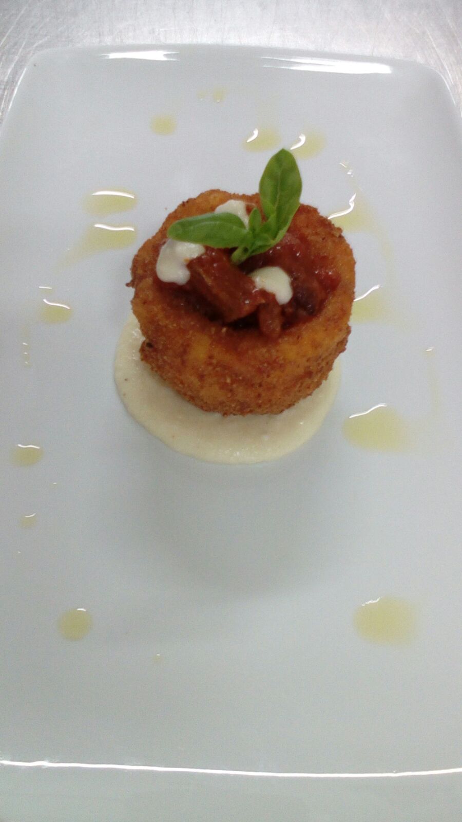 Per Molino Soprano, Pace presenta una semisfera di arancina, a mo’ di canestro, con ragù di frisona e caciocavallo ragusano, ma anche con maialino nero e un tocco di ricotta.