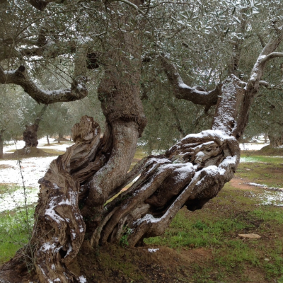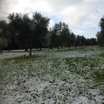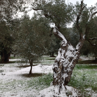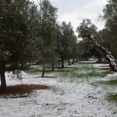 L'attesa del nuovo anno, dopo un 2014 un po' difficile per gli olivi. Ora si riposano, quieti, aspettando la nuova olivagione. Saranno, quelli che li attendono, mesi di speranza e di paziente lavoro da parte degli olivicoltori. A salutarli, il giorno di San Silvestro, c'è la neve, che li ha ricoperti anche nel Salento