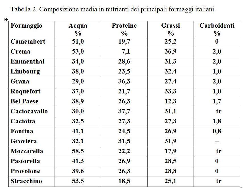 Un altro esempio che si può produrre è il salame tipo Milano con piccoli puntini bianchi di grasso, come anche l’ungherese, in confronto a quello umbro e toscano che contengono lardelli larghi ben visibili: questi ultimi contengono circa il 27% di grasso e sono istintivamente considerati più grassi dei primi che contengono invece oltre il 31-34 % di grasso (Tabella 1). Analogamente la mortadella è considerata grassa, ma è al 28% e oggi è stata portata a 23-24%, molto meno del formaggio grana che è al 33-34% di grasso. Analoghe considerazioni possono essere rivolte alla categoria dei formaggi, veri e propri concentrati di latte (Tabella 2).