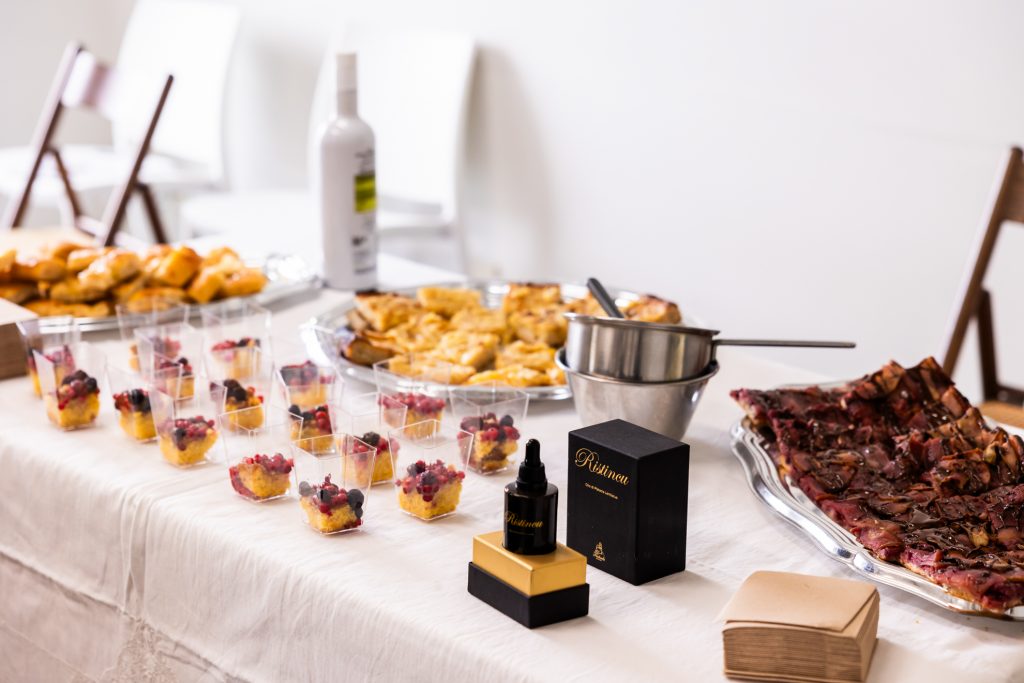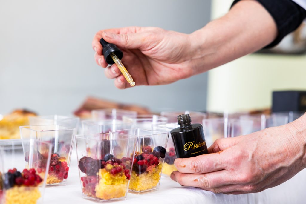 La prima in assoluto per l’olio di lentisco sono state le due proposte di focacce dolci in cui ho azzardato, memore del fatto che nel 2015 feci un secondo posto al Campionato Mondiale proprio con l’abbinamento lamponi freschi e olio di lentisco. Come allora non ha avuto paura di osare, creando abbinamenti insoliti, sorprendenti che hanno suscitato emozioni sensoriali uniche mai provate prima, suscitando apprezzamenti da parte del pubblico presente in sala.