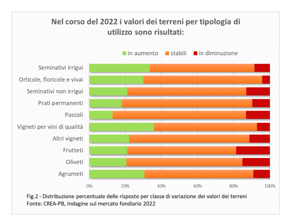 Dal sondaggio emerge che la crescita dell’inflazione non sembra aver avuto un impatto significativo sui prezzi della terra. In un contesto generale dove prevale l’invarianza delle quotazioni, vi sono ambiti che mostrano una certa crescita dei prezzi dei terreni, come nel caso dei vigneti per vini di qualità, i seminativi irrigui, gli agrumeti e l’orto-floro vivaismo, mentre segna un lieve calo dei prezzi per frutteti, oliveti e pascoli legate alle difficoltà gestionali e di mercato per le prime due tipologie, e alla marginalità dei terreni e alla riduzione degli allevamenti estensivi per l’ultima. Le prospettive di breve termine del mercato sull’evoluzione dei prezzi e degli scambi riguardano un cauto aumento dei prezzi a causa delle incertezze del contesto internazionale e dell’incremento dei costi delle materie prime e dell’energia, per cui è probabile una contrazione del numero dei potenziali acquirenti.